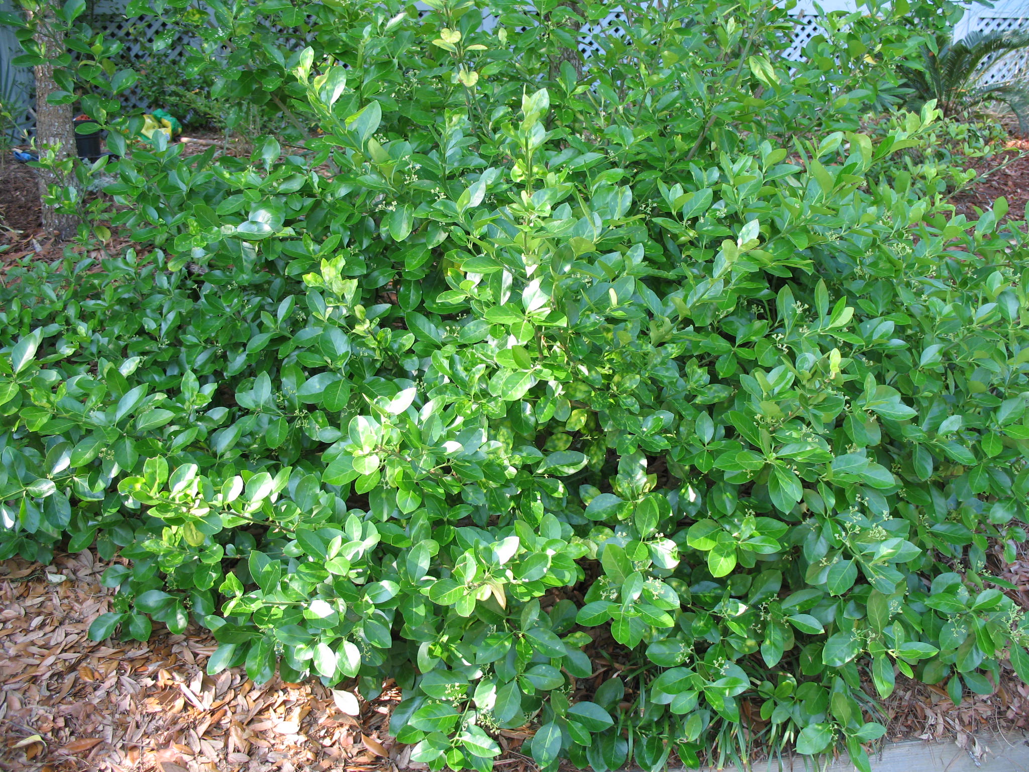 - Листья: мелкие, овальные, темно-зеленые с глянцевым блеском
