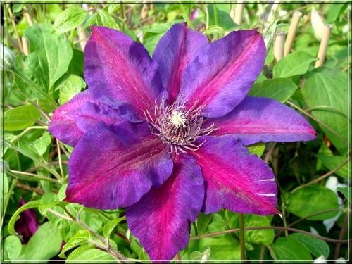 Клематис Миссис Н. Томпсон (Mrs. N. Thompson) – это изысканный многолетний вьющийся кустарник, который станет настоящим украшением вашего сада. Его крупные, яркие цветы с насыщенными фиолетово-синими лепестками и контрастной красной полосой по центру привлекают внимание и создают эффектный акцент в любом ландшафтном дизайне.